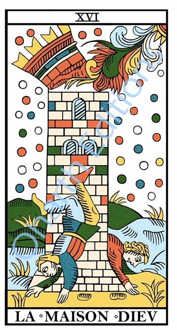 La Maison Dieu est un arcane où l’on peut tout remettre en question, casser vieux ancrages et vieux préjugés qui empêchent de voir clair et de prendre les bonnes décisions. La construction est un acte sacré, qui tente d’élever l’Homme. Toutefois, elle devient source d’orgueil et d’égocentrisme quand les constructeurs oublient la divinité pour laquelle elle fut construite.