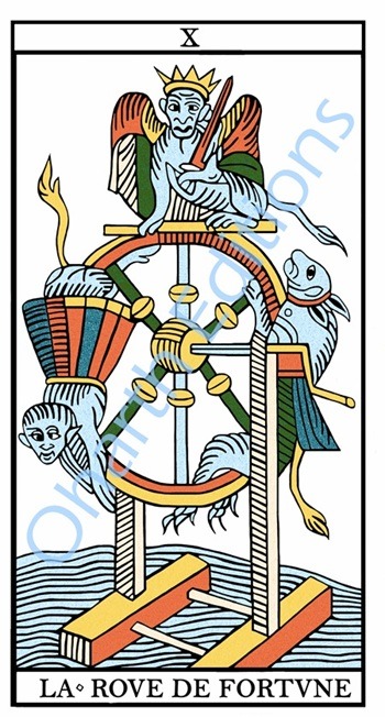 La Roue de Fortune est signe de fatalité, du destin, de l’imprévu et de la chance, symbolisant la partie incontrôlable et irrationnelle de la vie. Elle est associée au périssable, aux faits de la vie matérielle et donne à l’humain la possibilité d’avoir une action sur son devenir par la découverte des lois et des causes qui expliquent les événements et les actes de cette vie matérielle.