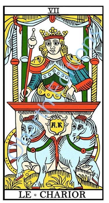 Le Chariot rappelle le char d’Apollon ou de Phébus, ce qui le rattache au symbolisme des chars solaires responsables de la migration de l’astre du jour. Il marque une première victoire : le conducteur sort du cube symbolisant la matière. Cependant, l’arcane comporte plusieurs contradictions : les roues ne sont pas dans le sens de la marche et les chevaux tirent dans des directions divergentes. La victoire est précaire et demande une évolution pour être confirmée.