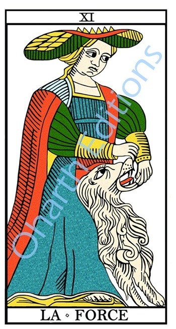 La Force, c’est l’indépendance, la maîtrise de ses pulsions et de son énergie intérieure. La Force est seule, aucun accessoire ne l’accompagne, c’est la lame des guérisseurs, elle symbolise l’état final du développement de la puissance interne.
