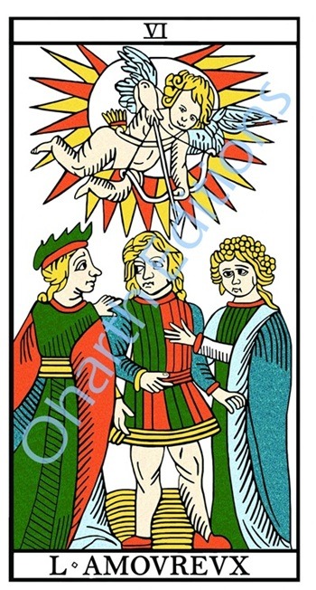 L’Amoureux représente la première véritable épreuve du parcours initiatique proposé par le tarot. Il pose le problème de la voie : le personnage doit choisir entre matière et spiritualité. Il a une décision à prendre sans oublier l’ange, messager du Soleil.