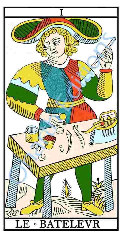 Le Bateleur est un jeune homme, il représente l’initiable, il est le point de départ. Son potentiel se manifeste par les objets qui sont sur sa table. Il prend conscience que son cadre est trop petit et que l’illusion qui lui sert à abuser les autres le trompe lui aussi. Il doit décider de changer de plan et de partir pour un autre type de voyage.