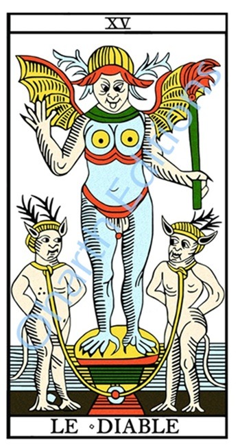 Le Diable est l’arcane de la confrontation au pouvoir. Il fait référence à la partie restée animale en l’Homme, à sa maîtrise ou à son défaut de maîtrise des principes qui sont actifs en lui. La voie spirituelle implique le dépassement de ce stade. Le personnage est de face, l’expérience est à vivre dans le présent.