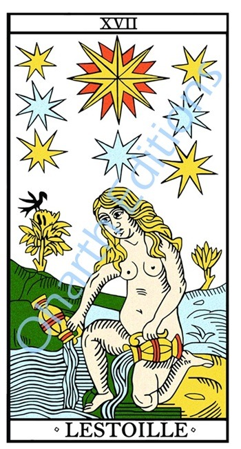 L’Étoile, symbole de la destinée et de l’idéal qu’il faut rechercher, brille sans fard. Elle est aussi liée à la vérité, car elle est nue. Elle se présente en toute pureté. C’est l’arcane qui ouvre les portes du plan céleste. Avec l’Étoile, le plan des principes devient directement accessible. Elle constitue le premier contact direct et la première étape vers leur appropriation.