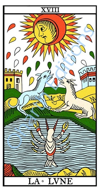 La Lune, c’est le monde de la lumière reflétée, celui de l’illusion, des mirages, de la nuit, de la sensibilité, de l’intuition artistique ou divinatoire. Il faut régresser au plus profond de soi-même, comme l’écrevisse dans la piscine, pour échapper aux fantasmes de la Lune. De plus, elle est régulatrice des cycles. Beaucoup de calendriers sont lunaires.