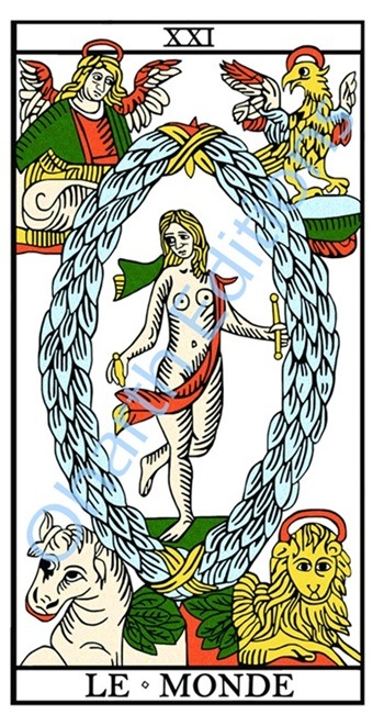 Le Monde est la dernière carte numérotée, donc la dernière à être dans la structure du jeu. Paradoxalement, le Monde marque à la fois un aboutissement et la source de sa création, comme si le but de tout ce voyage était de remonter à cette source. Arcane de la quintessence, il allie l’aboutissement extérieur, symbolisé par les quatre figures aux coins de la lame et la réalisation intérieure, représentée par le personnage central. Ce qui est en jeu est la réalisation complète de l’individu par une démarche globale. L’équilibre transmis par l’arcane induit un travail autant sur l’intérieur que sur l’extérieur pour trouver la plénitude.