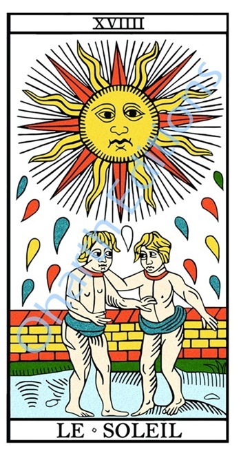 Le Soleil incarne l’astre sacré et symbolise les vertus positives, actives et masculines. Avec la Lune (18), ils forment un couple équilibré. Le Soleil fut de tout temps l’objet d’un culte énonçant sa force comme principe de vie. Pourtant, il va et vient. Les satisfactions qu’il donne s’évanouissent quand il disparaît. Le Soleil est une lame de passage dont il faut dépasser les délices temporaires pour un bonheur plus durable.